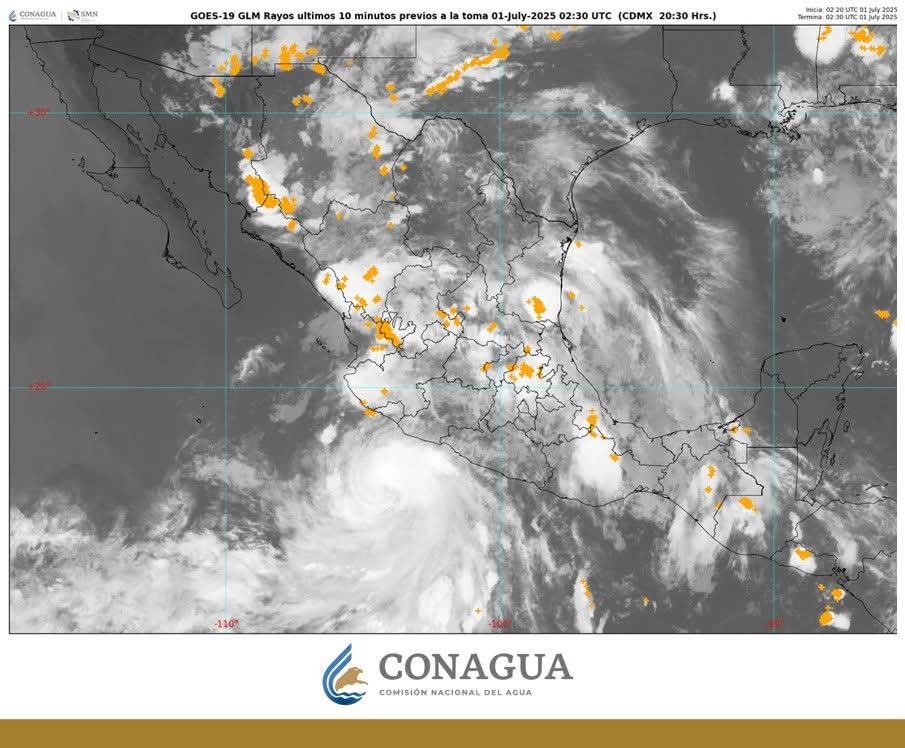 Sus bandas nubosas junto con el arrastre de humedad que genera, mantendrá el pronóstico de lluvias torrenciales (de 150 a 250 milímetros [mm]) en Colima y Michoacán; intensas (de 75 a 150 mm) en Sinaloa (sur), Nayarit (norte, sierra y sur), Jalisco (oeste, costa y sur) y Guerrero (suroeste); vientos de 100 a 120 km/h con rachas de 130 a 140 km/h en las costas de Jalisco, Colima y Michoacán, y de 40 a 50 km/h con rachas de 60 a 70 km/h en la costa occidental de Guerrero, así como oleaje de 5 a 6 metros (m) de altura en Jalisco, Michoacán y Colima, y de 3.5 a 4.5 m de altura en la costa occidental de Guerrero de Manzanillo, Colima, con vientos máximos sostenidos de 145 kilómetros por hora (km/h),