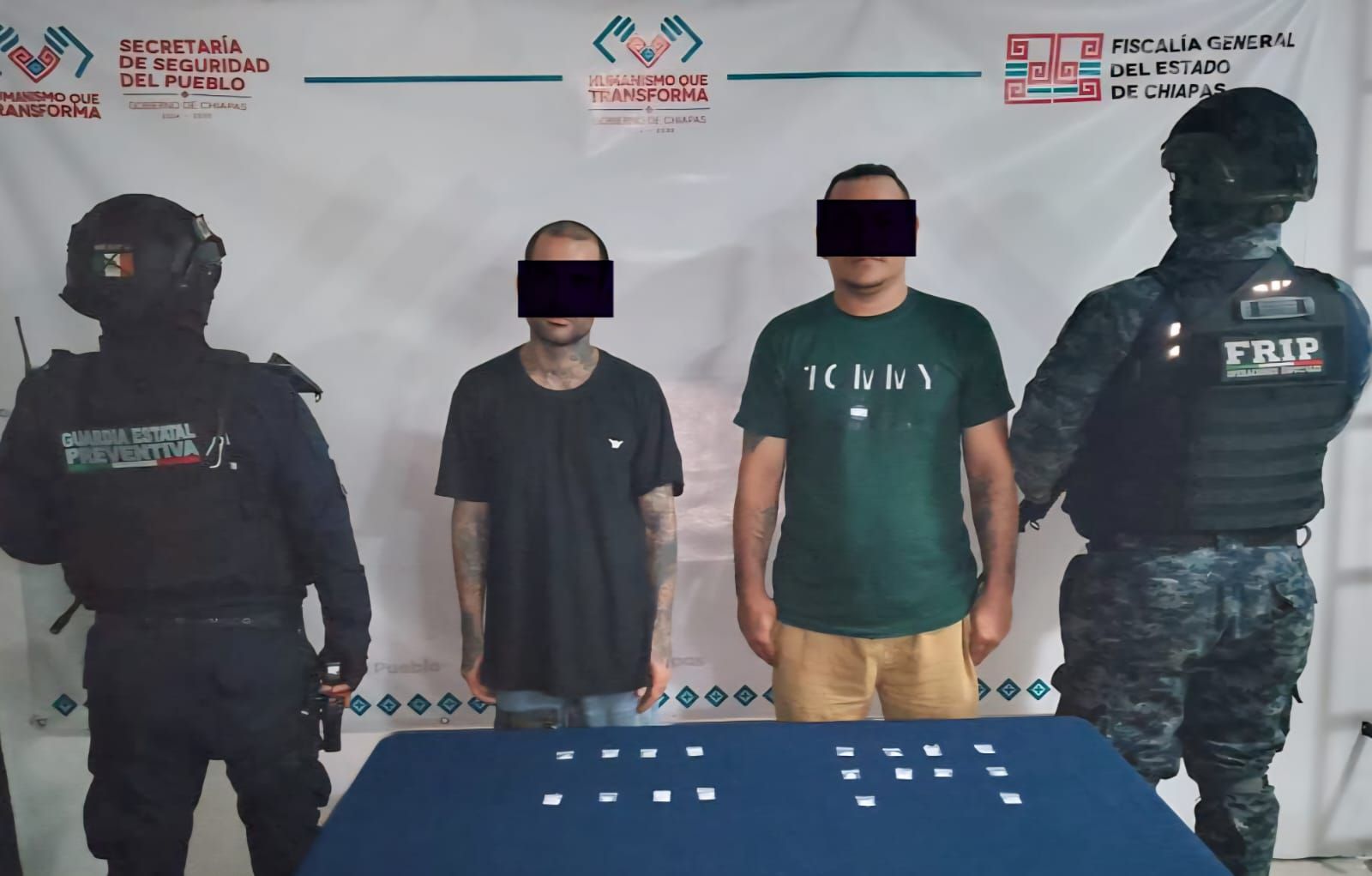 La Secretaría de Seguridad del Pueblo (SSP) a través de la Fuerza de Reacción Inmediata Pakal (FRIP) y la Guardia Estatal Preventiva, en coordinación con la Fiscalía General del Estado (FGE) y la Secretaría de Seguridad y Protección Ciudadana (SSPC) del Gobierno Federal, detuvieron a dos personas por el posible delito contra la salud, en los municipio de Tapachula.