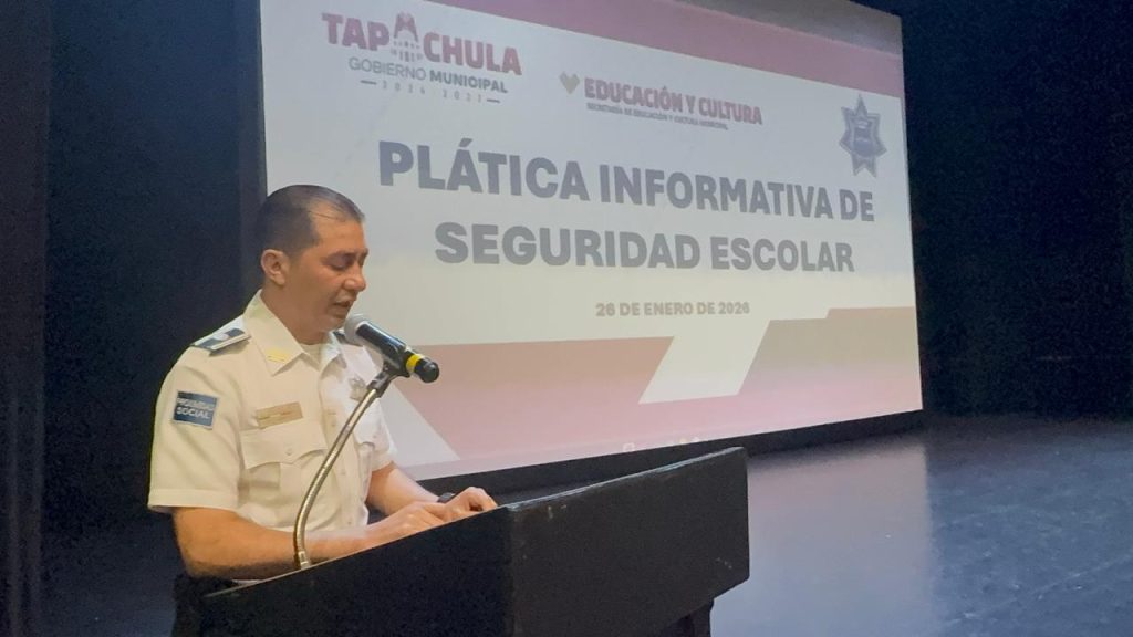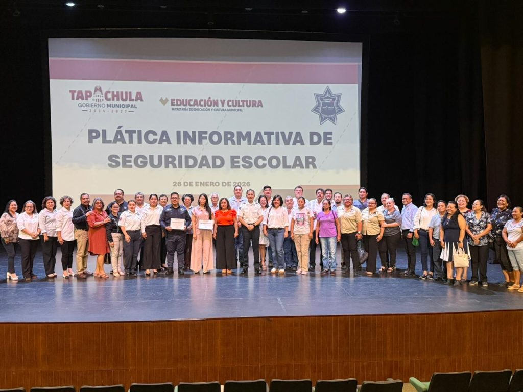 26 de enero 2026, Tapachula, Chiapas.- Las Secretarías de Educación y Cultura y Seguridad Pública y Protección Ciudadana Municipal, realizaron la Plática Informativa de Seguridad Escolar, dirigida a directivos y docentes de los niveles básico, medio superior y superior, en el Teatro de la Ciudad «Amparo Montes», como parte de la estrategia de acercamiento y diálogo con la población, impulsada por el presidente municipal de Tapachula, Yamil Melgar Bravo.