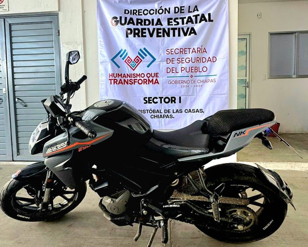 La Secretaría de Seguridad del Pueblo, a través de la Guardia Estatal Preventiva y la Fuerza de Reacción Inmediata Pakal (FRIP) en coordinación con la Agencia de Investigación e Inteligencia Ministerial (AIIM) de la Fiscalía General del Estado (FGE) y la Secretaría de Seguridad y Protección Ciudadana (SSPC) del Gobierno Federal, detuvieron a un masculino por conducir una motocicleta con reporte de robo, en el municipio de San Cristóbal de Las Casas.