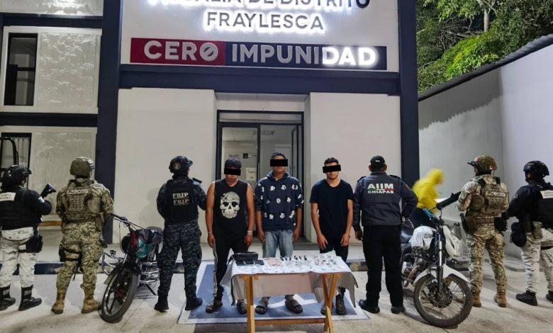 El Grupo Interinstitucional, conformado por la Fiscalía General del Estado, la Secretaría de la Defensa Nacional, la Guardia Nacional y la Secretaría de Seguridad del Pueblo, ejecutaron la detención de Daniel “N”, Carlos “N” y Marcos “N” como presuntos responsables del delito contra la salud en su modalidad de narcomenudeo con fines de comercio, cometido en agravio de la salud pública, por hechos ocurridos en el municipio de Villaflores.