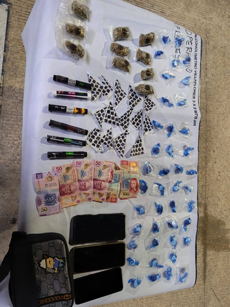 De acuerdo con los hechos, los elementos del orden, al estar realizando recorridos preventivos en la zona, tuvieron a la vista a los inculpados y al realizarles una inspección se les localizaron tres teléfonos celulares, dinero en efectivo, seis cigarros de marihuana, 10 bolsitas con marihuana, 42 bolsitas con cocaína, 14 bolsitas con cristal y una mariconera.