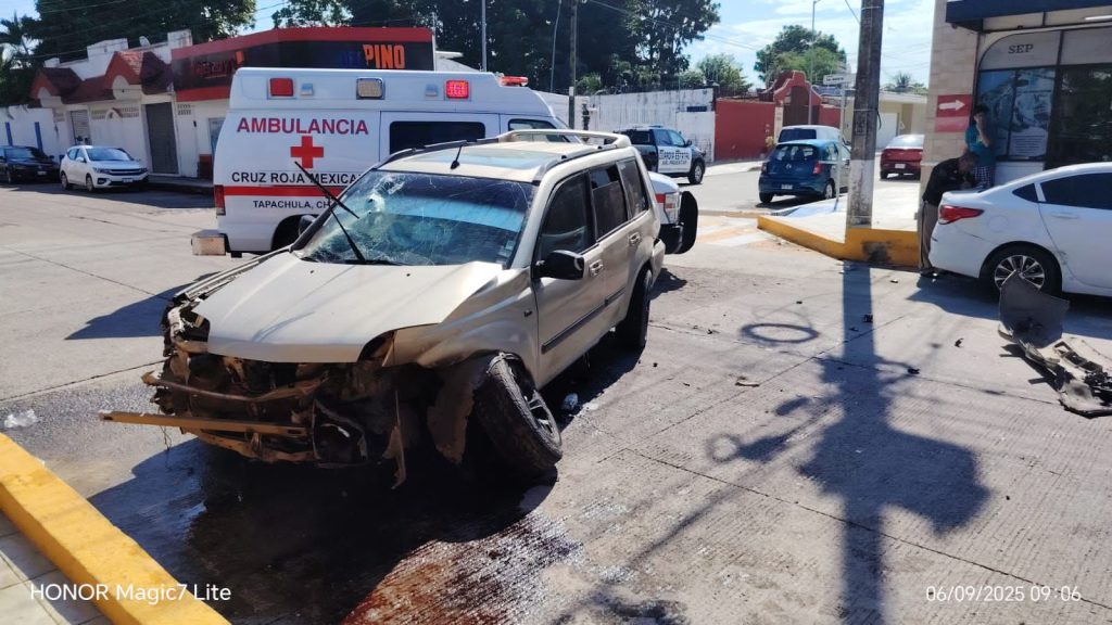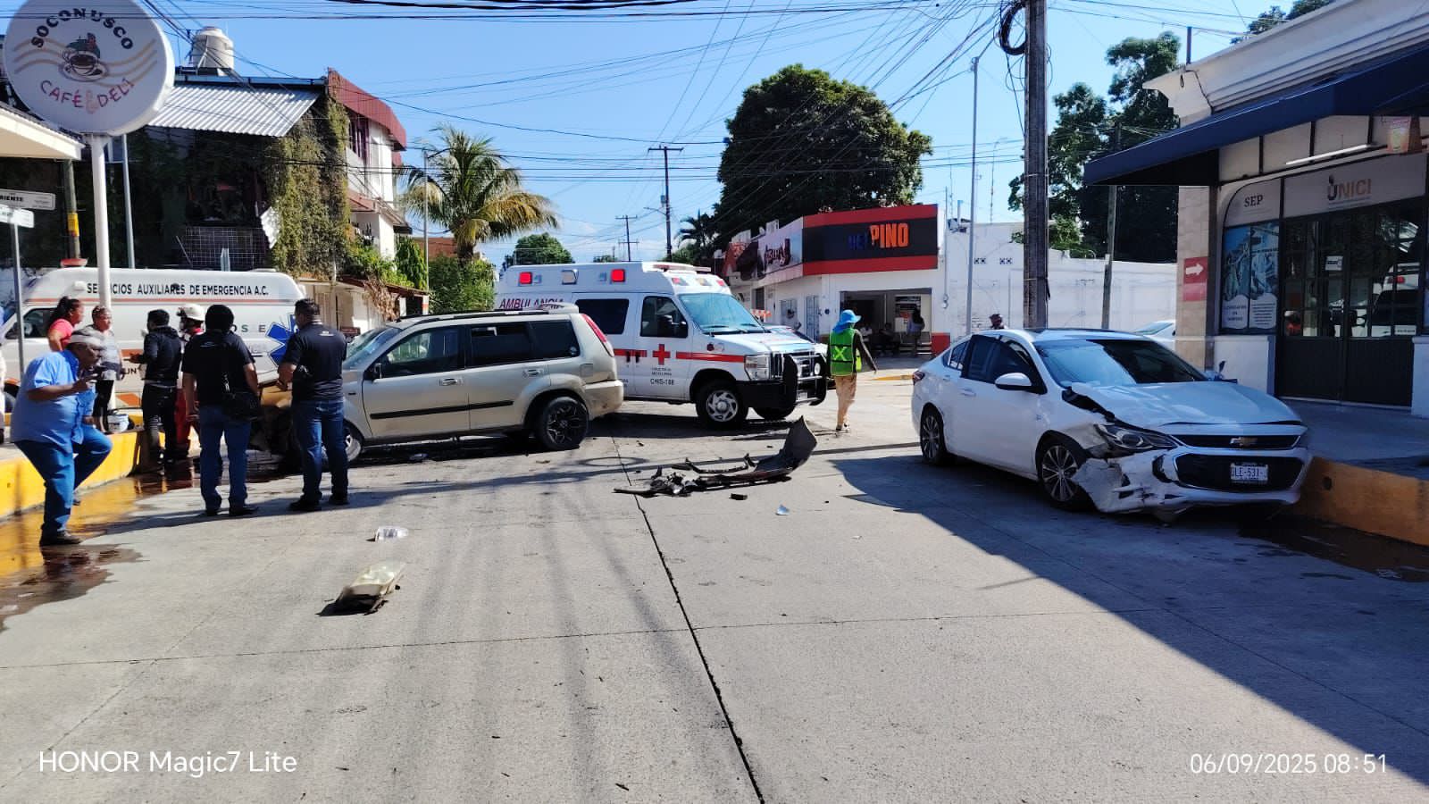 Tapachula, Chiapas; 6 de septiembre de 2025. — La mañana de este sábado a las 9:15 se registró un aparatoso accidente en la esquina de la 3a Avenida Norte y 15a Calle Oriente, que dejó como saldo cuatro personas lesionadas y dos vehículos con pérdida total, además de daños valuados en más de 350 mil pesos.