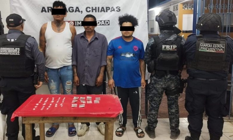 El Grupo Interinstitucional conformado por la Guardia Estatal Preventiva, Fuerza de Reacción Inmediata Pakal y la Fiscalía General del Estado detuvo a Erick “N”, Carlos “N” y Misrain “N”, como presuntos responsables del delito contra la salud, en su modalidad de posesión simple de los narcóticos denominados cristal y marihuana, en agravio de la sociedad, por hechos ocurridos el 30 de enero de 2026 en el municipio de Arriaga.