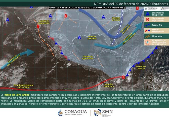 Este día, la masa de aire ártico que generó al frente núm. 32, modificará sus características térmicas, permitiendo un gradual incremento de las temperaturas diurnas en gran parte de la República Mexicana; sin embargo, durante la mañana y noche el ambiente se mantendrá frío a muy frío sobre la Mesa del Norte, la Mesa Central y el oriente del país. También prevalecerá viento de componente norte con rachas de 70 a 90 km/h en el istmo y golfo de Tehuantepec, así como rachas de 40 a 60 km/h en Yucatán y Quintana Roo. Un canal de baja presión prevalecerá sobre el occidente del golfo de México, originando lluvias y chubascos en estados del noreste, oriente y sureste del territorio mexicano. Finalmente, el ingreso de humedad del océano Pacífico ocasionará lluvias y chubascos con posibles descargas eléctricas en estados del occidente, centro y sur del territorio nacional.