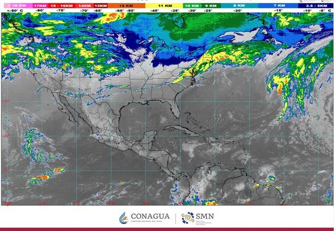 Para hoy, prevalecerá una circulación ciclónica y vaguada en altura, asociada a un canal de baja presión en superficie, lo que ocasionarán intervalos de chubascos en estados del occidente, centro, oriente y sur del país, con lluvias puntuales fuertes en zonas de Puebla y Veracruz. Otro canal de baja presión en el sureste mexicano, en combinación con el ingreso de humedad del mar Caribe, generará lluvias y chubascos en Tabasco, Chiapas y la península de Yucatán, con lluvias puntuales fuertes en zonas de Oaxaca. Por otra parte, una circulación anticiclónica en niveles medios de la atmósfera mantendrá ambiente caluroso a muy caluroso sobre la República Mexicana. Asimismo, continuará la onda de calor en Chihuahua (suroeste), Durango (noroeste), Jalisco (centro y sur), Colima (este), Guerrero (centro y sur) y Oaxaca (sur y este); finalizando en Sinaloa, e iniciando a partir de hoy en Michoacán (centro y suroeste) y Chiapas (suroeste). Finalmente, un nuevo frente frío se aproximará a la frontera norte y noreste de México, propiciará fuertes rachas de viento en dicha región.