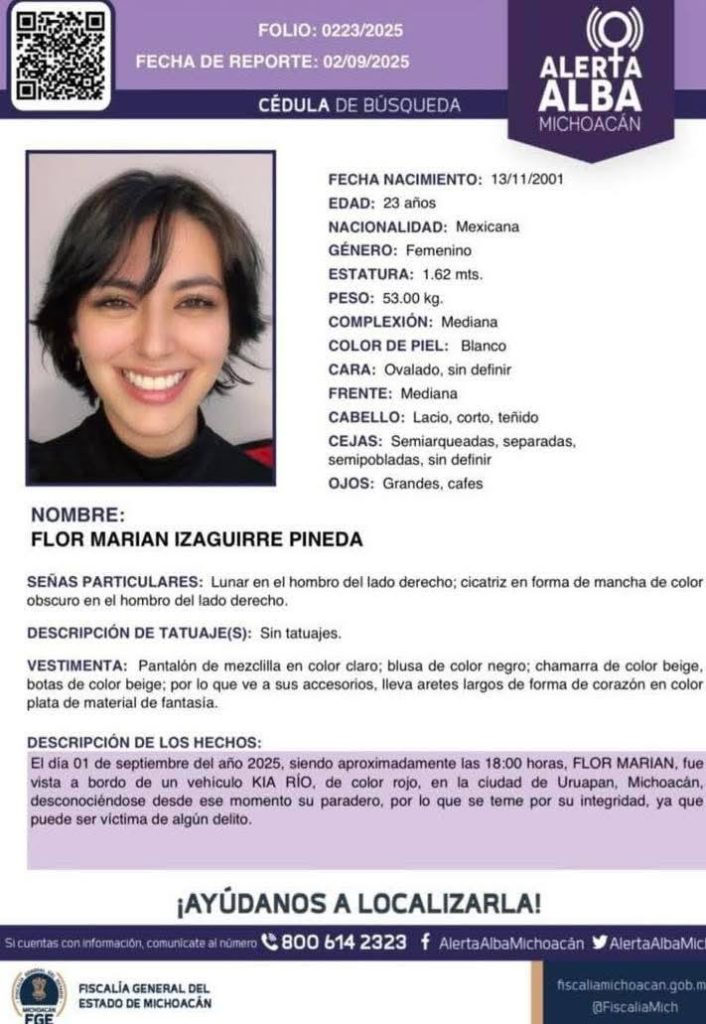 La Fiscalía General del Estado de Michoacán ha emitido una alerta Alba para su localización. Se le vio por última vez alrededor de las 18:00 horas a bordo de un vehículo Kia Río color rojo. Vestía pantalón de mezclilla claro, blusa negra, chamarra beige, botas beige y aretes largos en forma de corazón en color plata.
