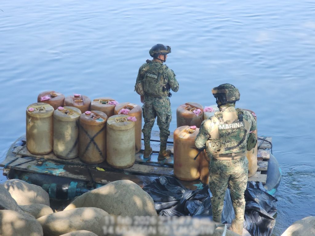 Lo anterior se llevó a cabo durante recorridos de vigilancia terrestre por parte del personal naval en el mencionado municipio, quienes avistaron bidones en calidad de abandono sobre una balsa en el Río de Suchiate.