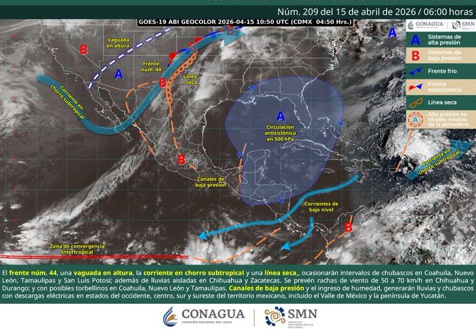 Este día, una línea seca prevalecerá en el norte del territorio nacional, en interacción con el frente núm. 44, que se extenderá cerca de la frontera norte de México, con una vaguada en altura y con la corriente en chorro subtropical, ocasionarán intervalos de chubascos en Coahuila, Nuevo León, Tamaulipas y San Luis Potosí; además de lluvias aisladas en Chihuahua y Zacatecas; dichas lluvias podrían estar acompañadas con descargas eléctricas y caída de granizo. Así mismo, se prevén rachas de viento de 50 a 70 km/h en Chihuahua y Durango; y con posible formación de torbellinos en Coahuila (norte), Nuevo León (norte) y Tamaulipas (noroeste). Por otra parte, canales de baja presión en el interior y sureste de la República Mexicana, aunados al ingreso de humedad del océano Pacífico, golfo de México y mar Caribe, generarán lluvias y chubascos con descargas eléctricas en estados del occidente, centro, sur y sureste del territorio mexicano, incluida la península de Yucatán. Finalmente, se mantendrá la onda de calor en Sinaloa (norte, centro y sur), Nayarit (norte y sur), Jalisco (oeste y sur), Colima (este y sur), Michoacán (centro y oeste), Guerrero (noroeste, este y sur), Morelos (sur), Puebla (suroeste) y Oaxaca (sur).