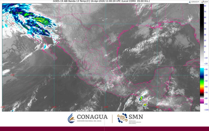 Para hoy, una línea seca que se extenderá sobre el noreste de la República Mexicana en interacción con la corriente en chorro subtropical, ocasionarán intervalos de chubascos con descargas eléctricas en Coahuila; y lluvias aisladas en zonas de Nuevo León, Tamaulipas, Zacatecas y San Luis Potosí. A su vez, se prevén rachas de viento de 50 a 70 km/h en Baja California, Sonora, Chihuahua, Durango y Tamaulipas; y rachas de 40 a 60 km/h en Baja California Sur, Sinaloa, Coahuila, Nuevo León, Zacatecas, San Luis Potosí y Aguascalientes. Por otra parte, canales de baja presión en el interior del país y el ingreso de aire húmedo del océano Pacífico, golfo de México y mar Caribe, generarán lluvias puntuales fuertes en Chiapas; y lluvias con chubascos en Oaxaca, las cuales se acompañarán con posibles descargas eléctricas; asimismo, se prevén lluvias aisladas en zonas de los estados del occidente, centro y sureste del territorio nacional, además de la península de Yucatán. Finalmente, se mantendrá la onda de calor en zonas de Sinaloa (centro y sur), Nayarit (norte y sur), Jalisco (oeste y sur), Colima (este), Michoacán (centro y oeste), Morelos (sur), Puebla (suroeste), Guerrero (noroeste, este y sur) y Oaxaca (sur). Se pronostica mar de fondo con oleaje de 2.0 a 3.0 metros de altura en costas de Jalisco, Colima, Michoacán, Guerrero, Oaxaca y Chiapas; además de oleaje de 1.0 a 2.0 metros de altura en la costa occidental de Baja california y Baja California Sur, y en costas de Tamaulipas, Veracruz, Tabasco, Campeche, Yucatán y Quintana Roo.