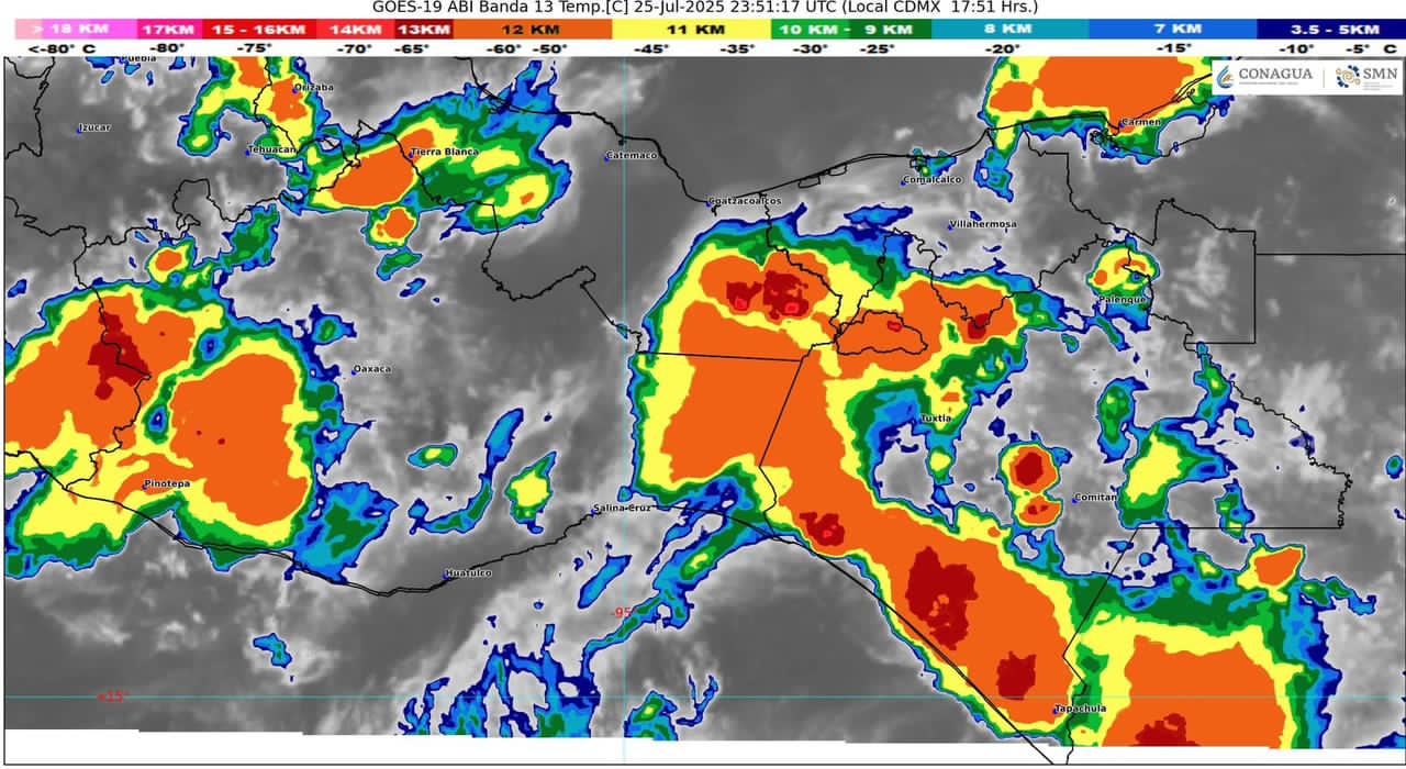 Tuxtla Gutiérrez, Chiapas. 25 de julio de 2025. Derivado del sistema de baja presión sobre el Suroeste del Golfo de México, el acercamiento de la Onda Tropical Número 15 y el ingreso de humedad del Pacífico, Mar Caribe y Golfo de México, se prevén lluvias y tormentas en gran parte de Chiapas.