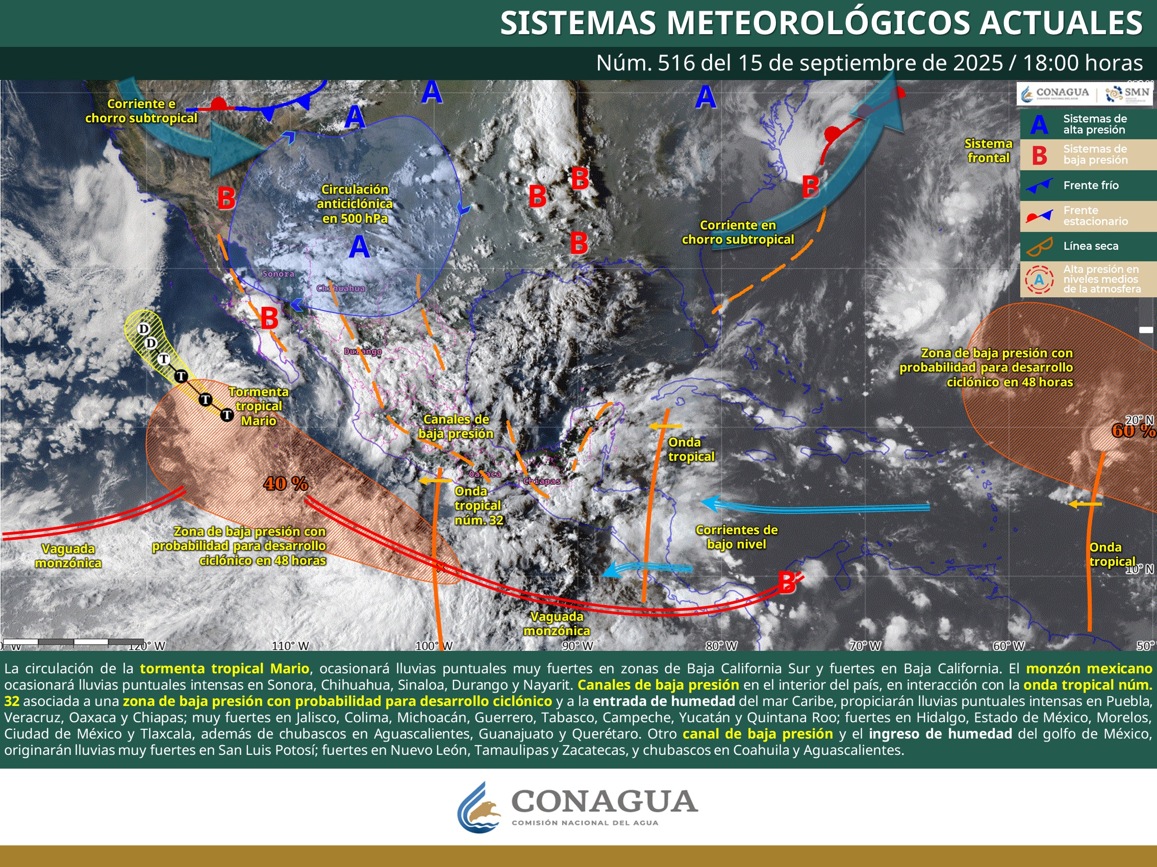 Para hoy, la tormenta tropical Mario se ubicará frente a la costa occidental de la península de Baja California y su circulación ocasionará lluvias puntuales muy fuertes en Baja California Sur, así como lluvias puntuales fuertes en Baja California, además de rachas de viento fuertes y oleaje elevado en la costa occidental de la península de Baja California.