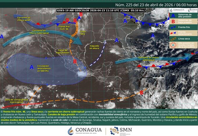 Para este día, el frente frío núm. 46 se extenderá sobre el noroeste de México; mientras que, una línea seca se establecerá en Coahuila, ambos sistemas interaccionarán con la corriente en chorro subtropical, generando rachas fuertes de viento en el noroeste y norte del país, así como lluvias fuertes en Coahuila y chubascos en Nuevo León y Tamaulipas, ambas precipitaciones con posible caída de granizo. Por otra parte, canales de baja presión sobre el interior del país, en combinación con inestabilidad atmosférica y el ingreso de humedad del océano Pacífico y golfo de México, originarán chubascos y lluvias puntuales fuertes en estados de la Mesa Central, occidente, sur y sureste del país, incluida la península de Yucatán. Por otra parte, una circulación anticiclónica en niveles medios de la atmósfera mantendrá la onda de calor en Durango (noroeste), Sinaloa (centro), Nayarit (sur), Jalisco (oeste y sur), Colima (este), Michoacán (sur y suroeste), Guerrero (noroeste, este y sur), Morelos y Oaxaca (sur) y dando inicio a partir de este día en Tamaulipas (suroeste), San Luis Potosí (centro y sur), Querétaro (centro), Hidalgo (norte y este), Veracruz (centro) y Chiapas (noroeste).