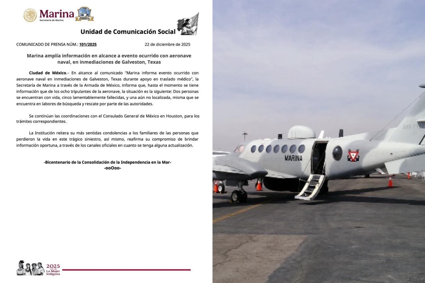 La Secretaría de Marina informó que se elevó a cinco el número de tripulantes fallecidos tras el desplome de una aeronave naval ocurrido en inmediaciones de Galveston, Texas, durante una misión de apoyo en traslado médico.