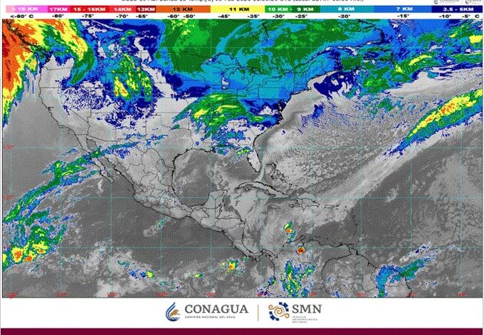 Por otra parte, canales de baja presión en la península de Yucatán, sureste y occidente del país, aunados al ingreso de humedad del océano Pacífico, generarán intervalos de chubascos con descargas eléctricas en Michoacán, Estado de México, Guerrero y Oaxaca. Finalmente, una circulación anticiclónica sobre el golfo de México originará viento de componente sur (surada) con rachas de 40 a 60 km/h en Tamaulipas y Veracruz. En el resto del país, se prevé ambiente cálido a caluroso durante la tarde con baja probabilidad de lluvia.